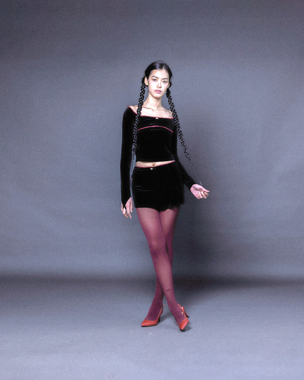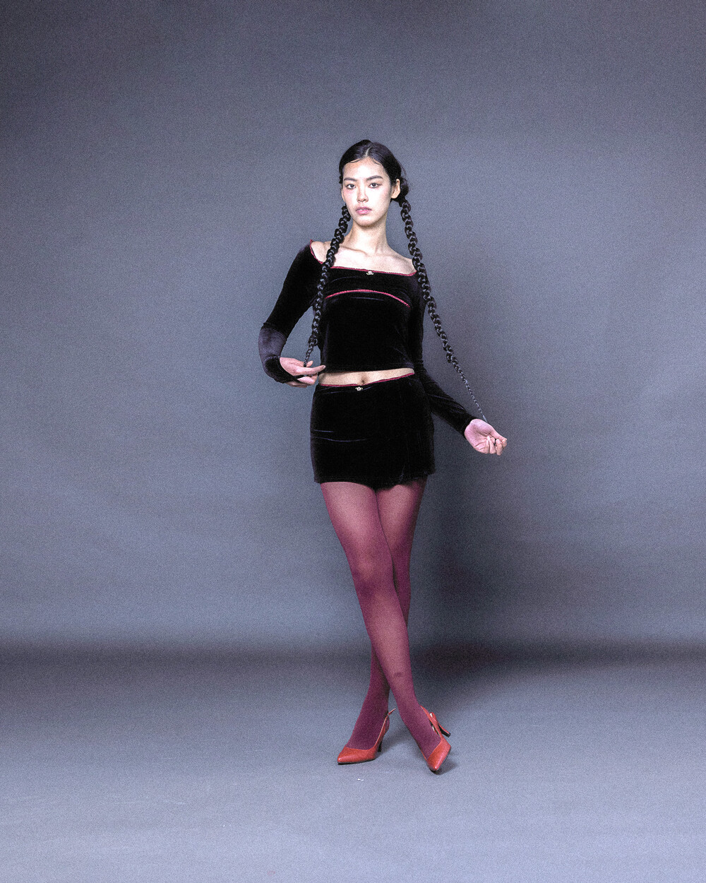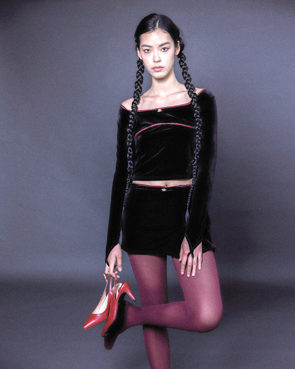 - 상의 넥라인과 가슴 절개 라인을 따라 와인 컬러 레이스