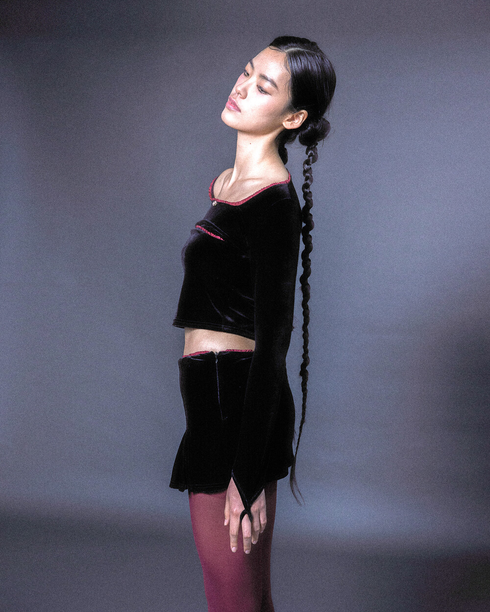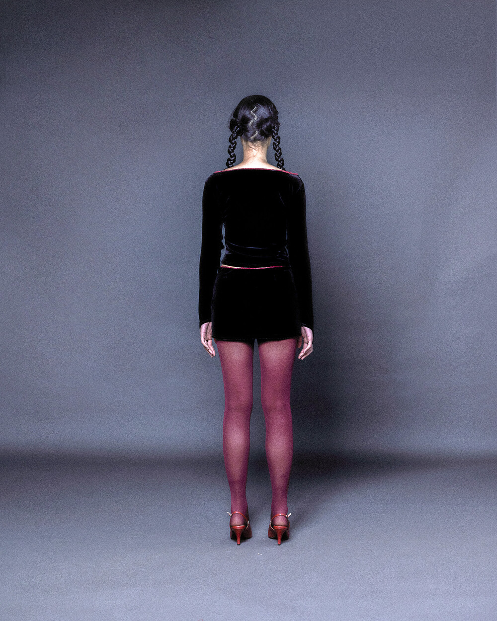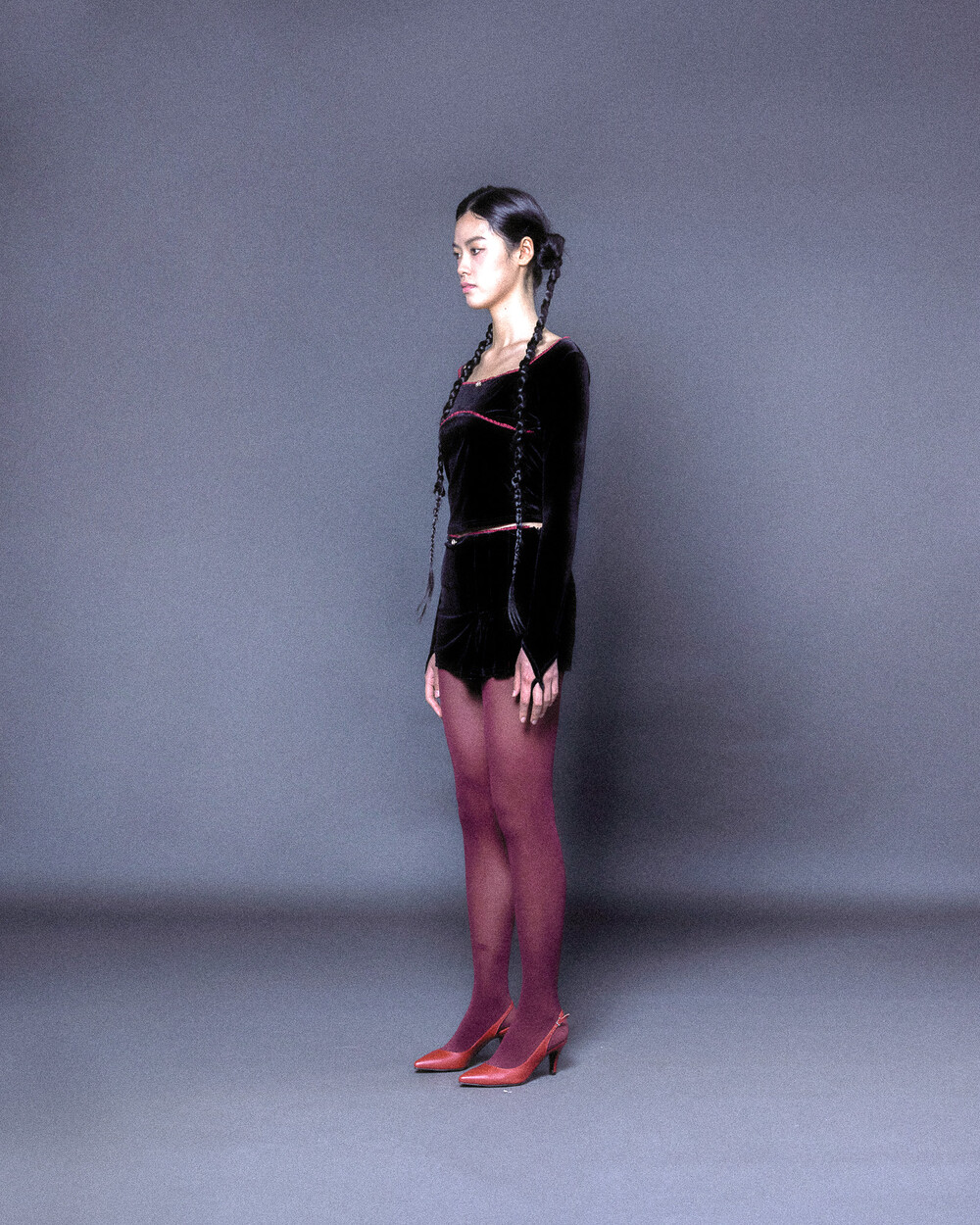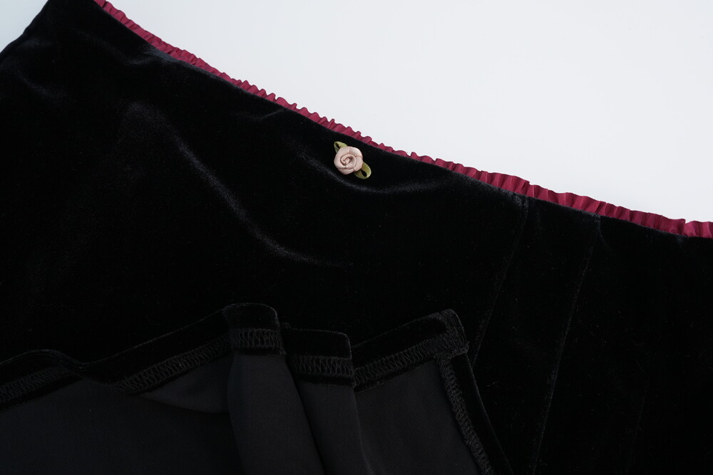 - 상의 넥라인과 가슴 절개 라인을 따라 와인 컬러 레이스