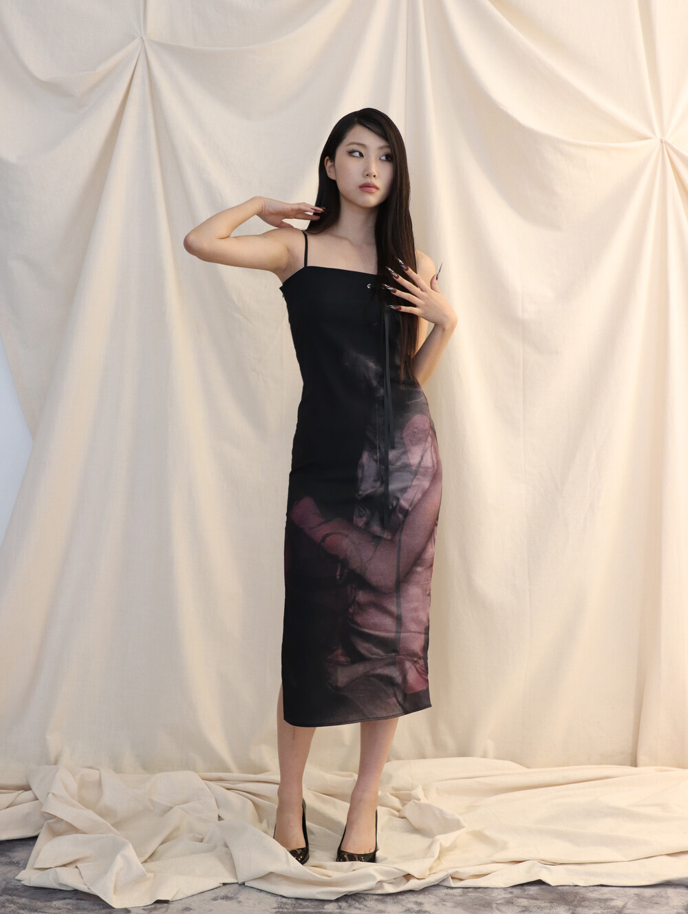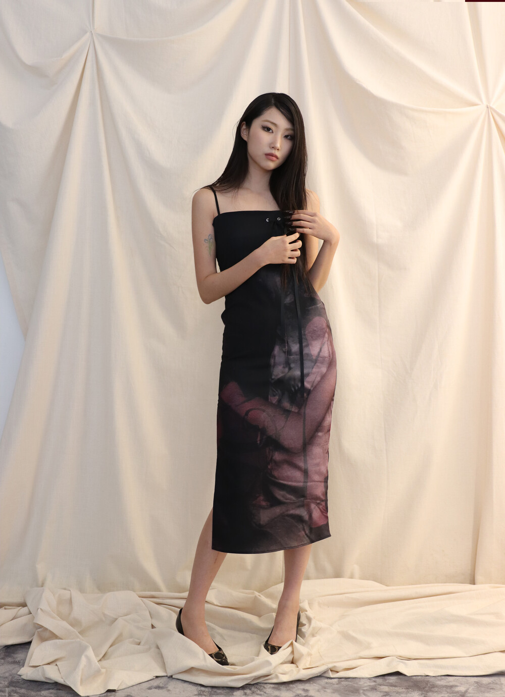 앞 뒤 같은 그래픽의 프린팅입니다. 신축성이 뛰어난 원단이며, 길이가 조절 가능한 어깨끈으로 다양한 체형을 커버가능합니다.