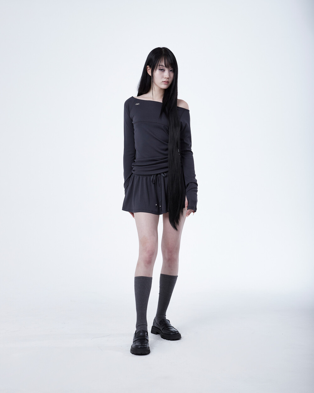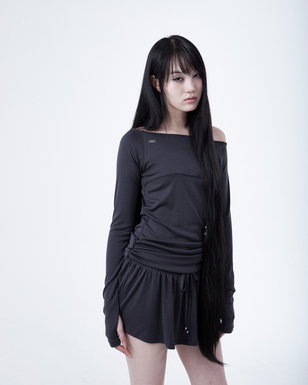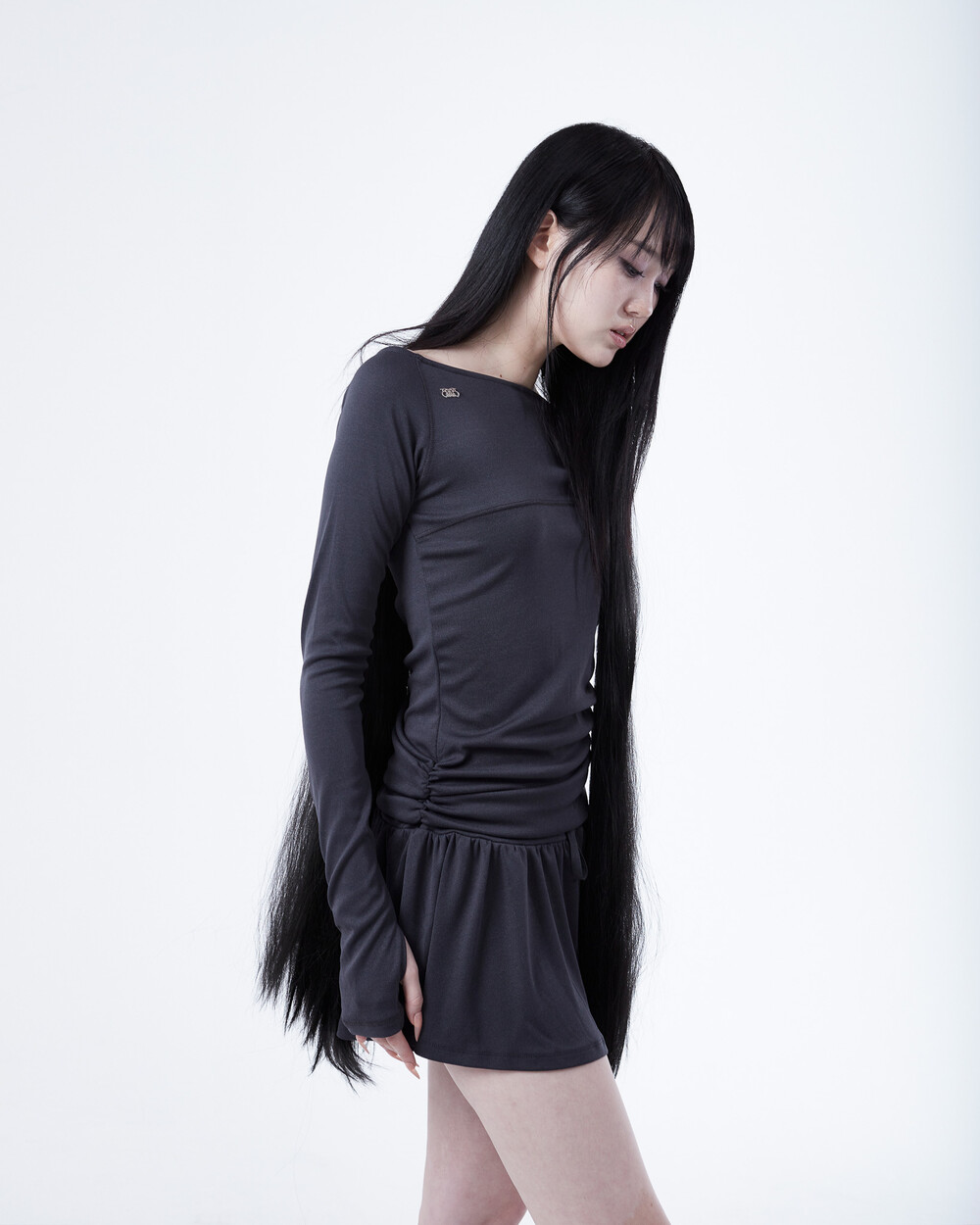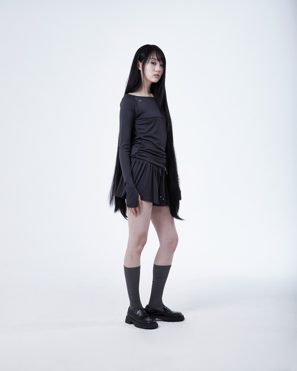 - 허리 밑 사이드에서 시작하는 셔링이 라인 보완