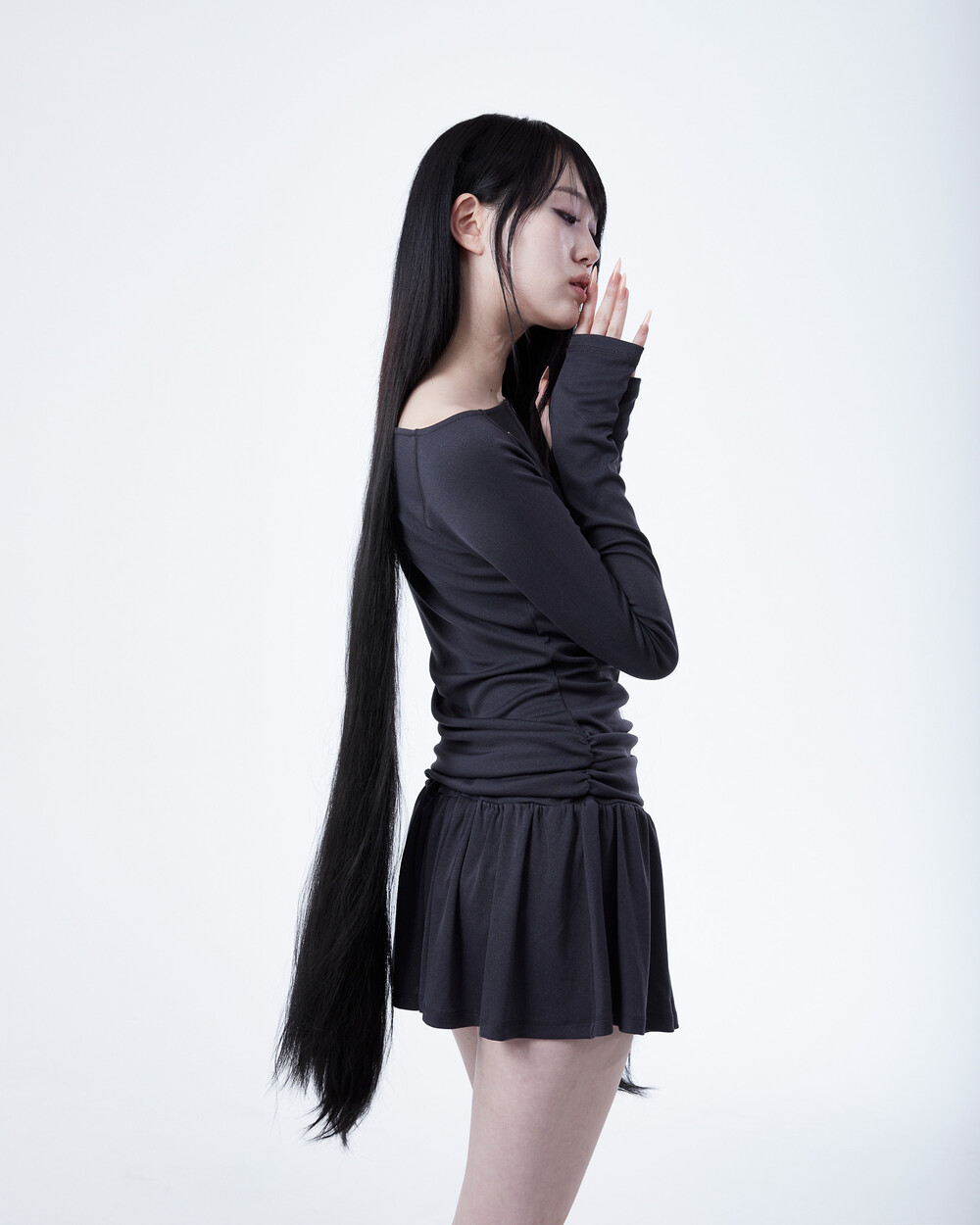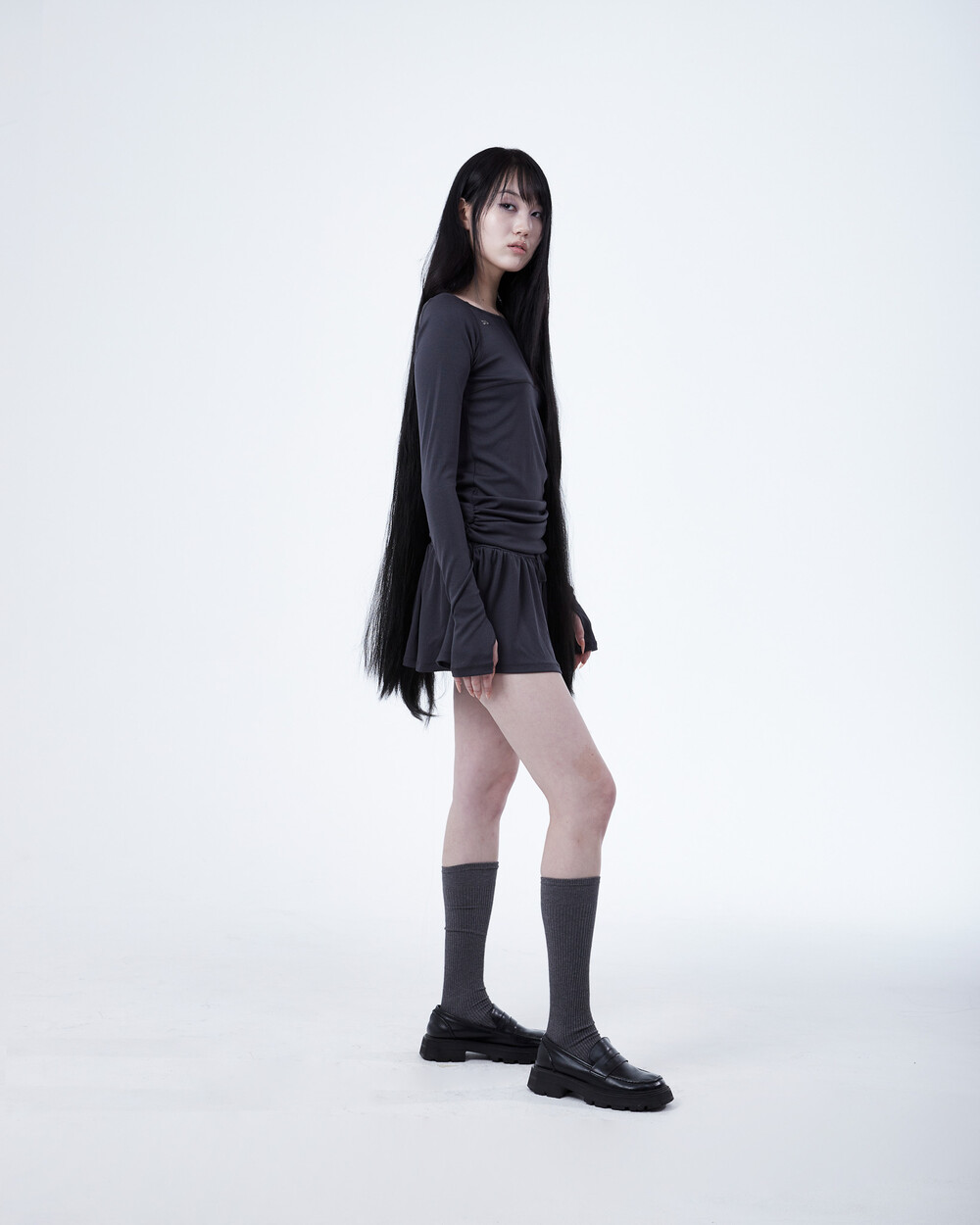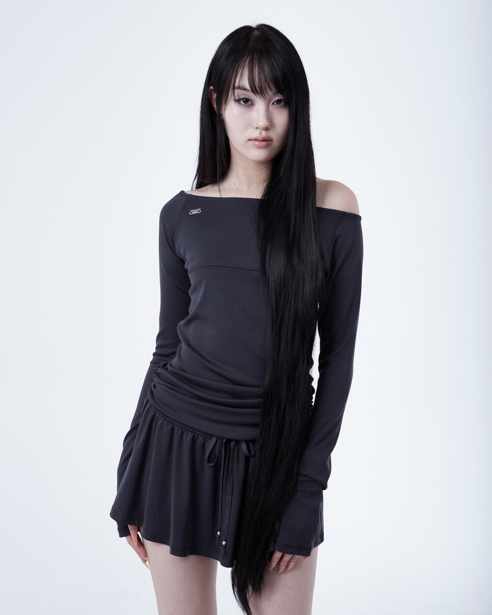 - 허리 밑 사이드에서 시작하는 셔링이 라인 보완