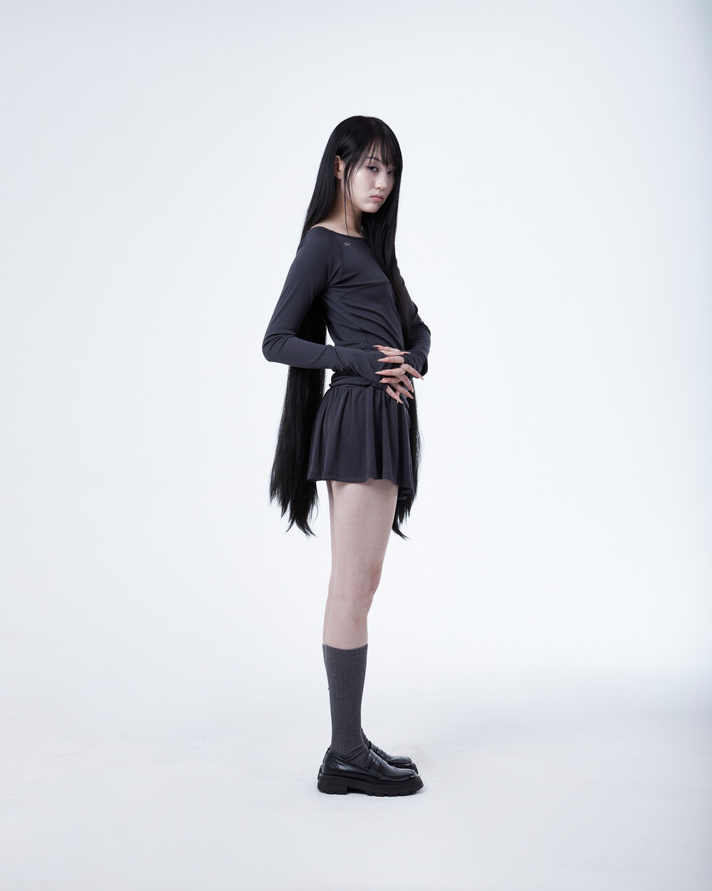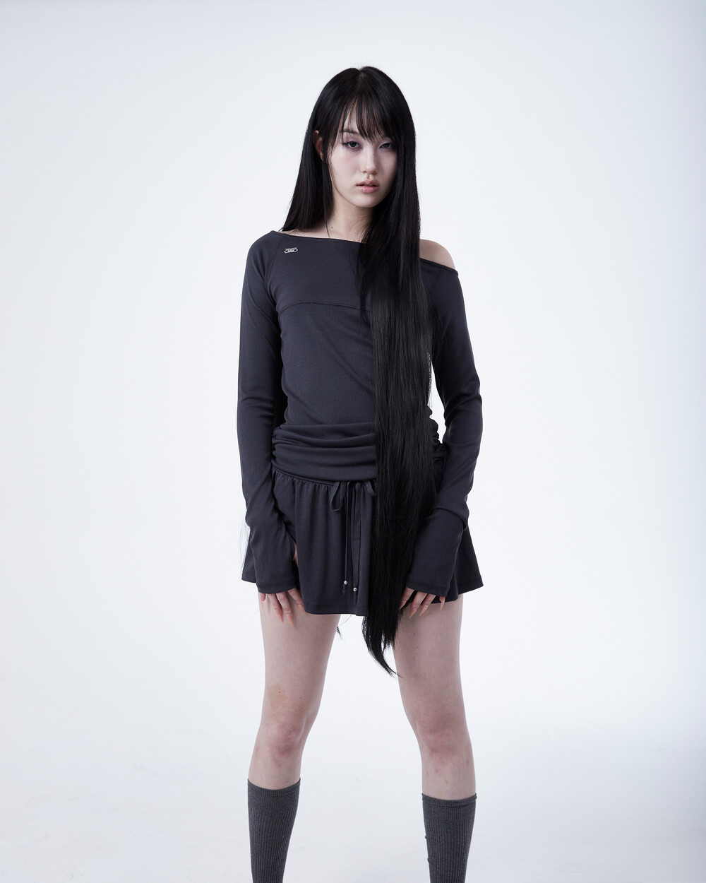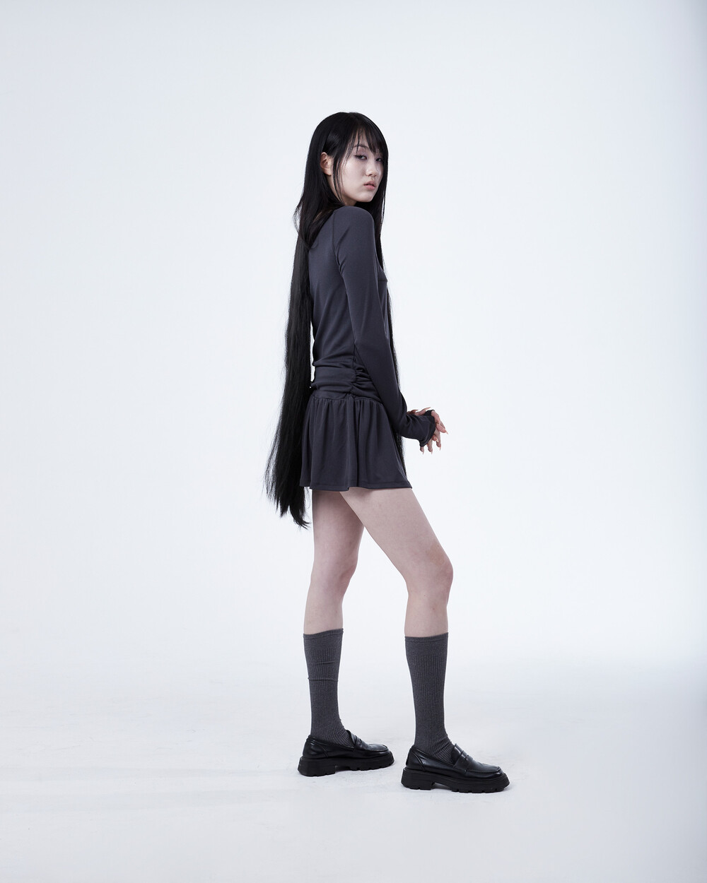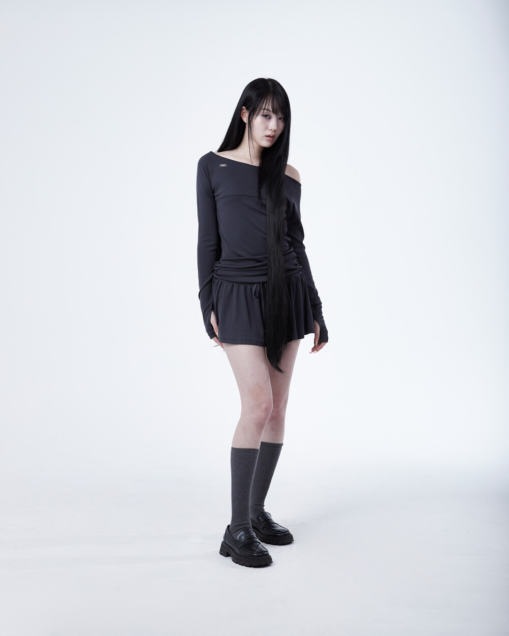 - 허리 밑 사이드에서 시작하는 셔링이 라인 보완