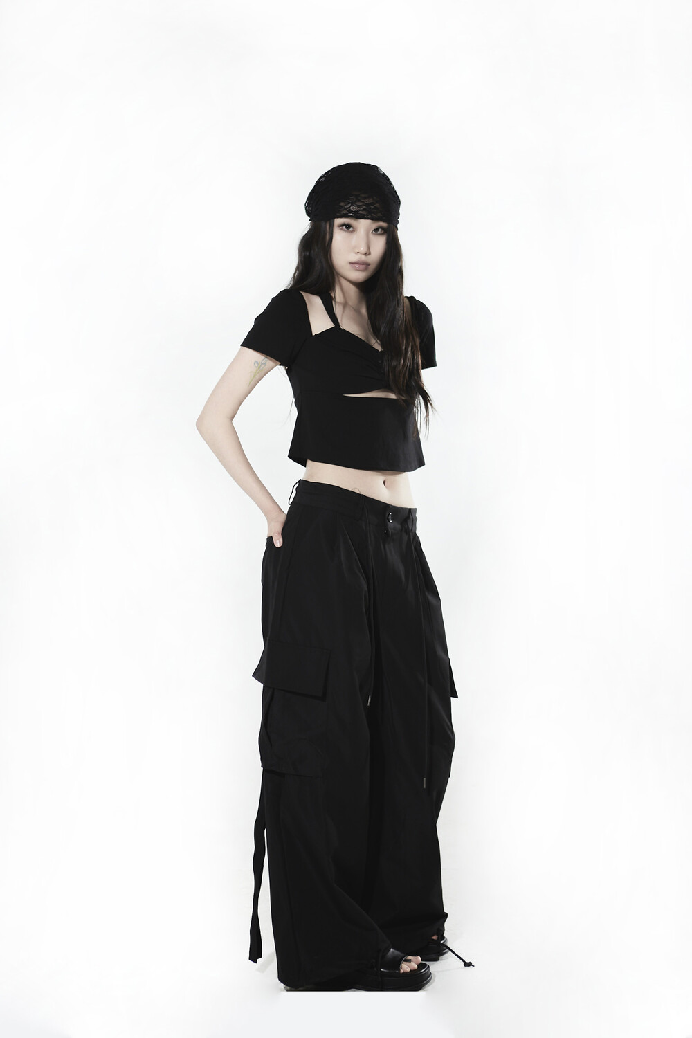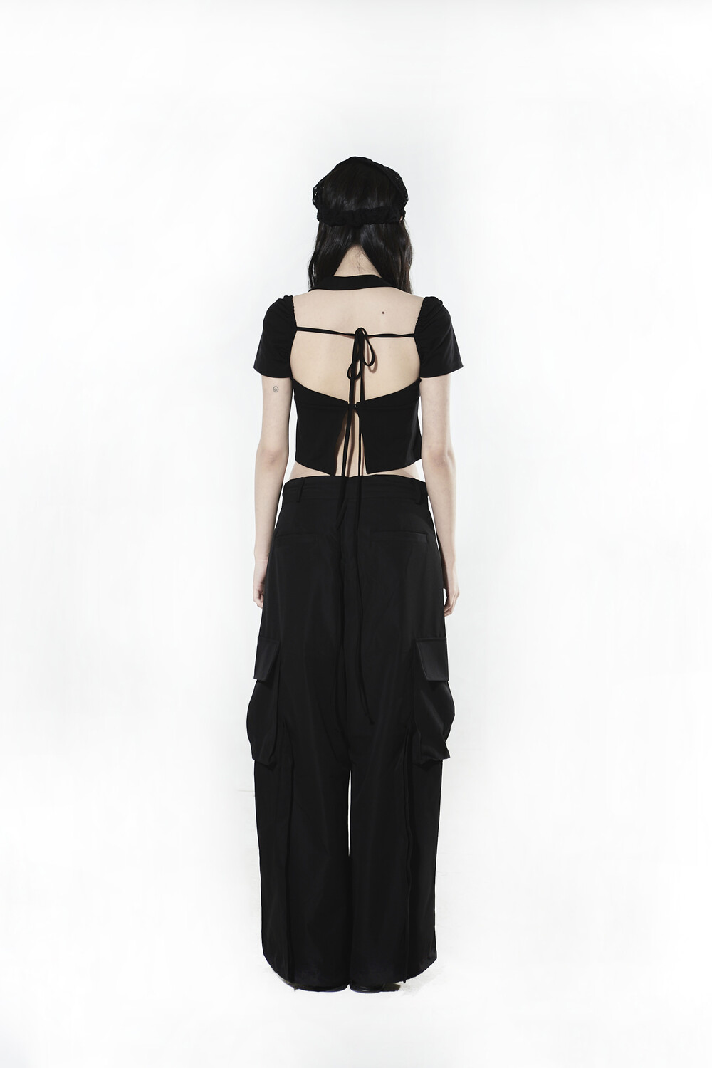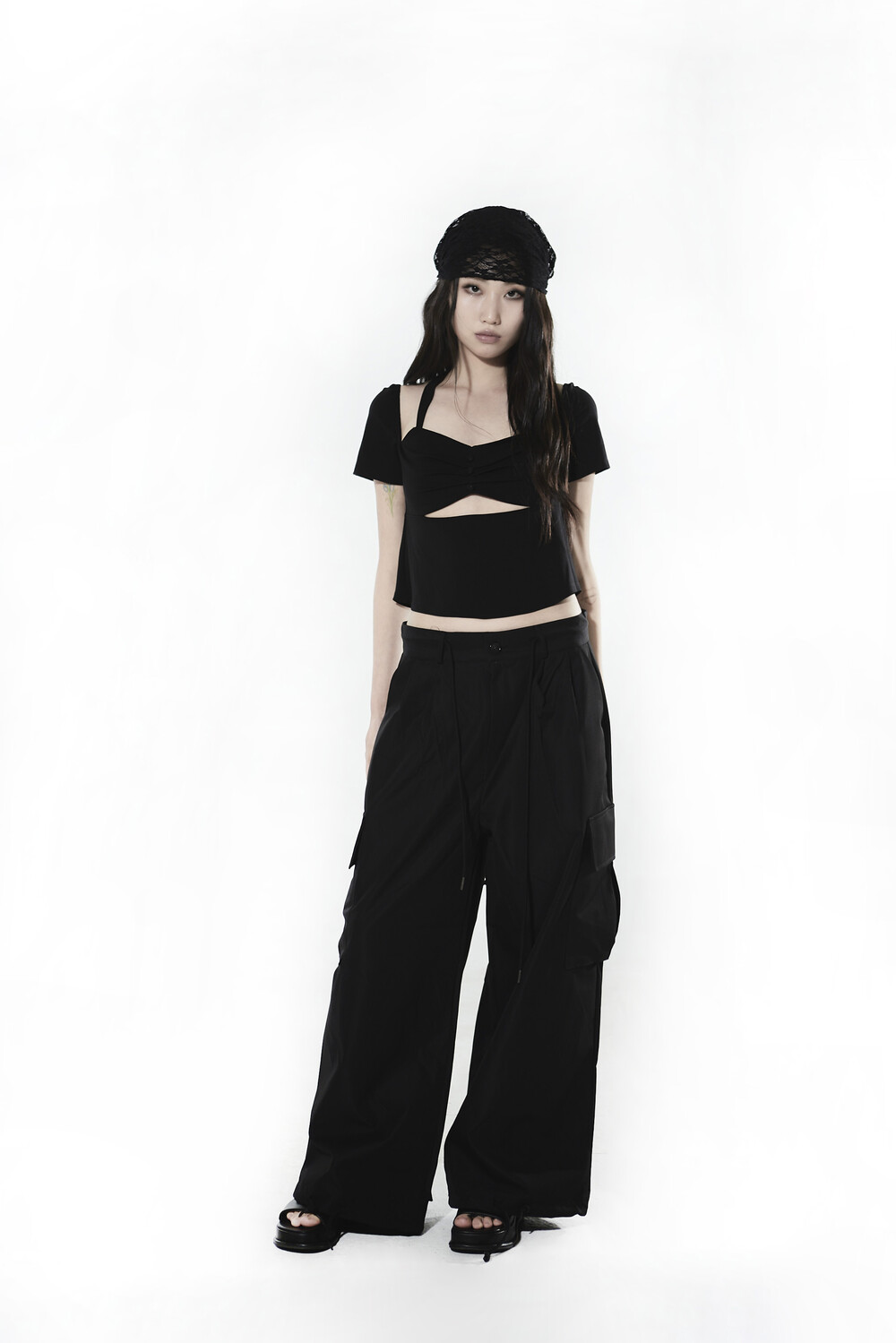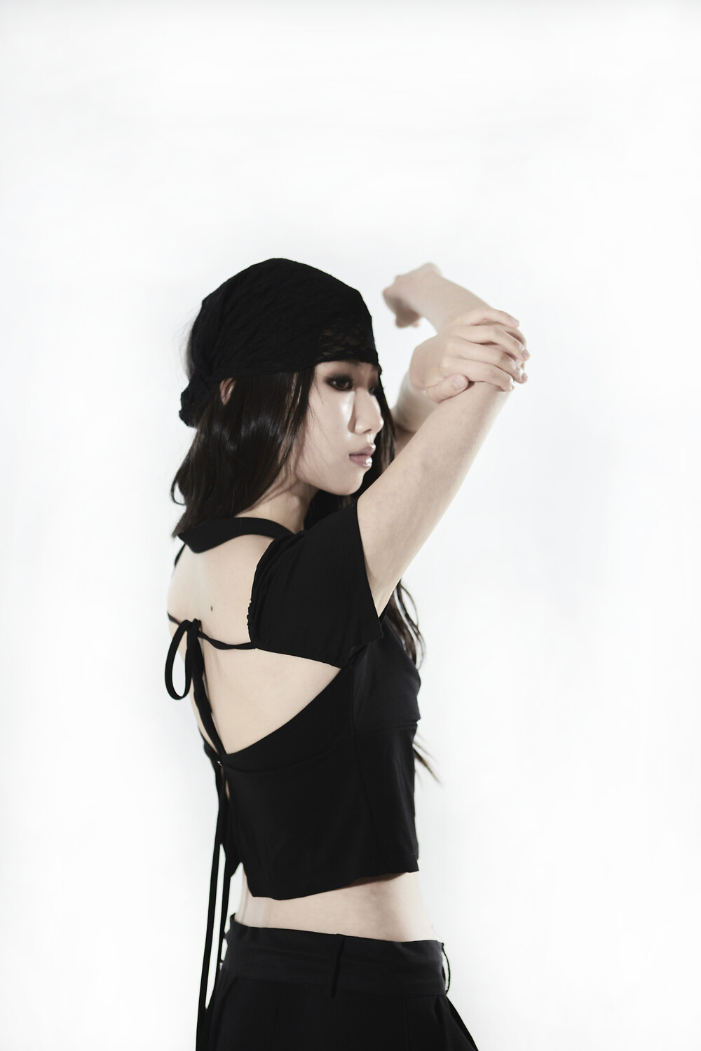 홀터넥, 앞트임의 백리스 디테일이 포인트로, 크롭한 기장의 블라우스 입니다. 캡 추가가 가능하여 속옷 노출 없이 착용하실 수 있습니다.