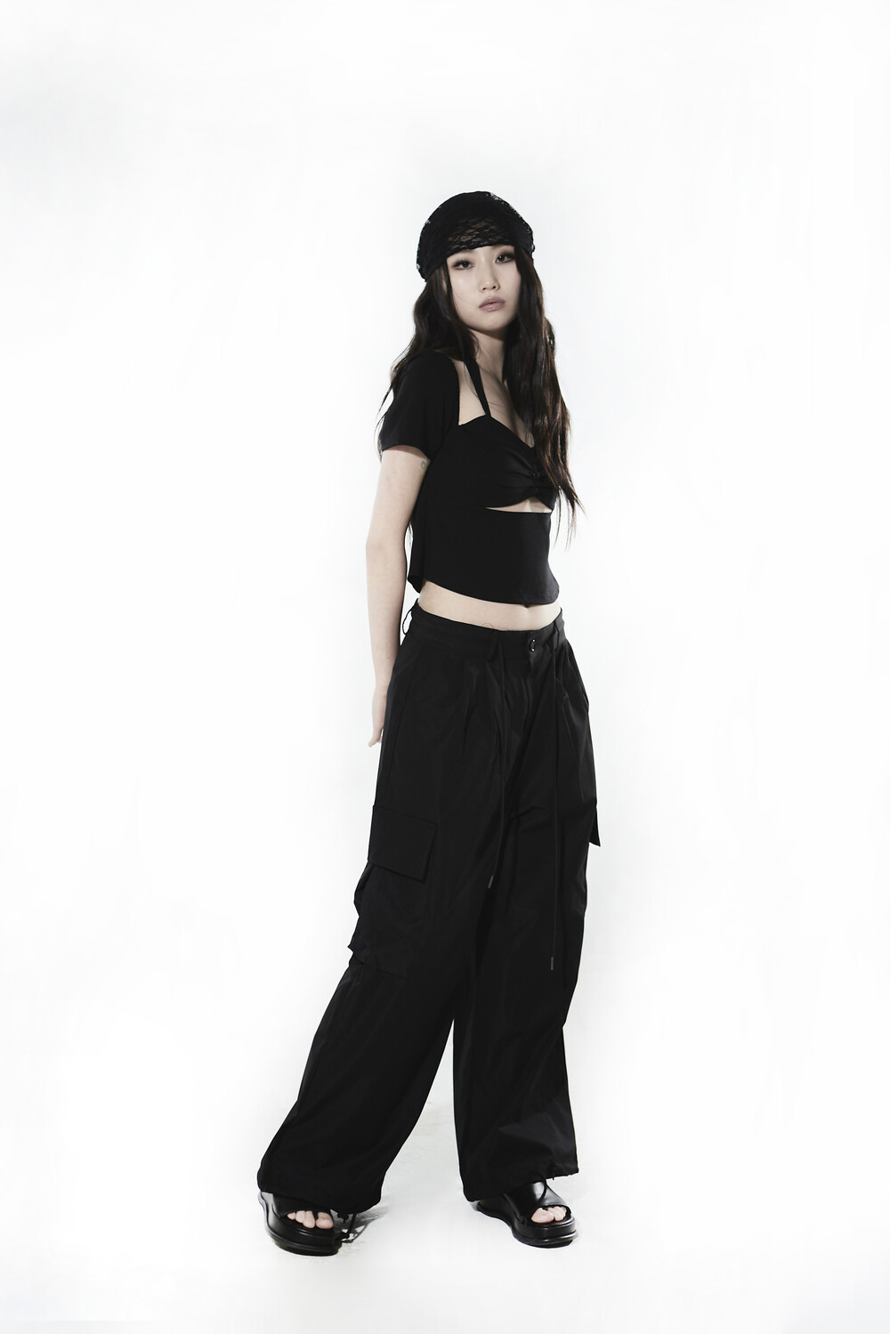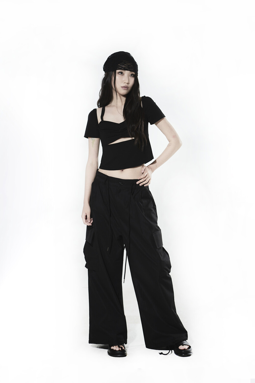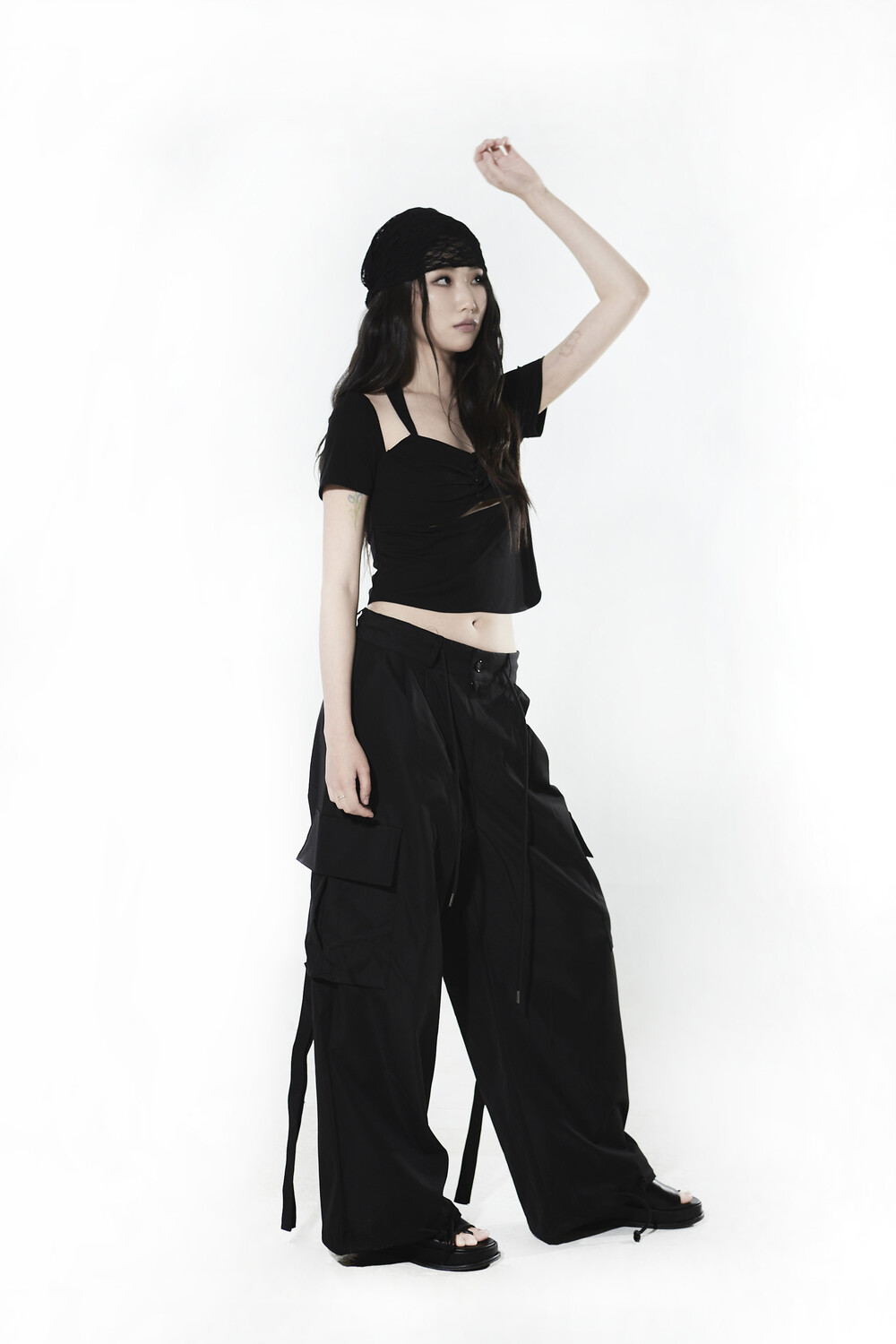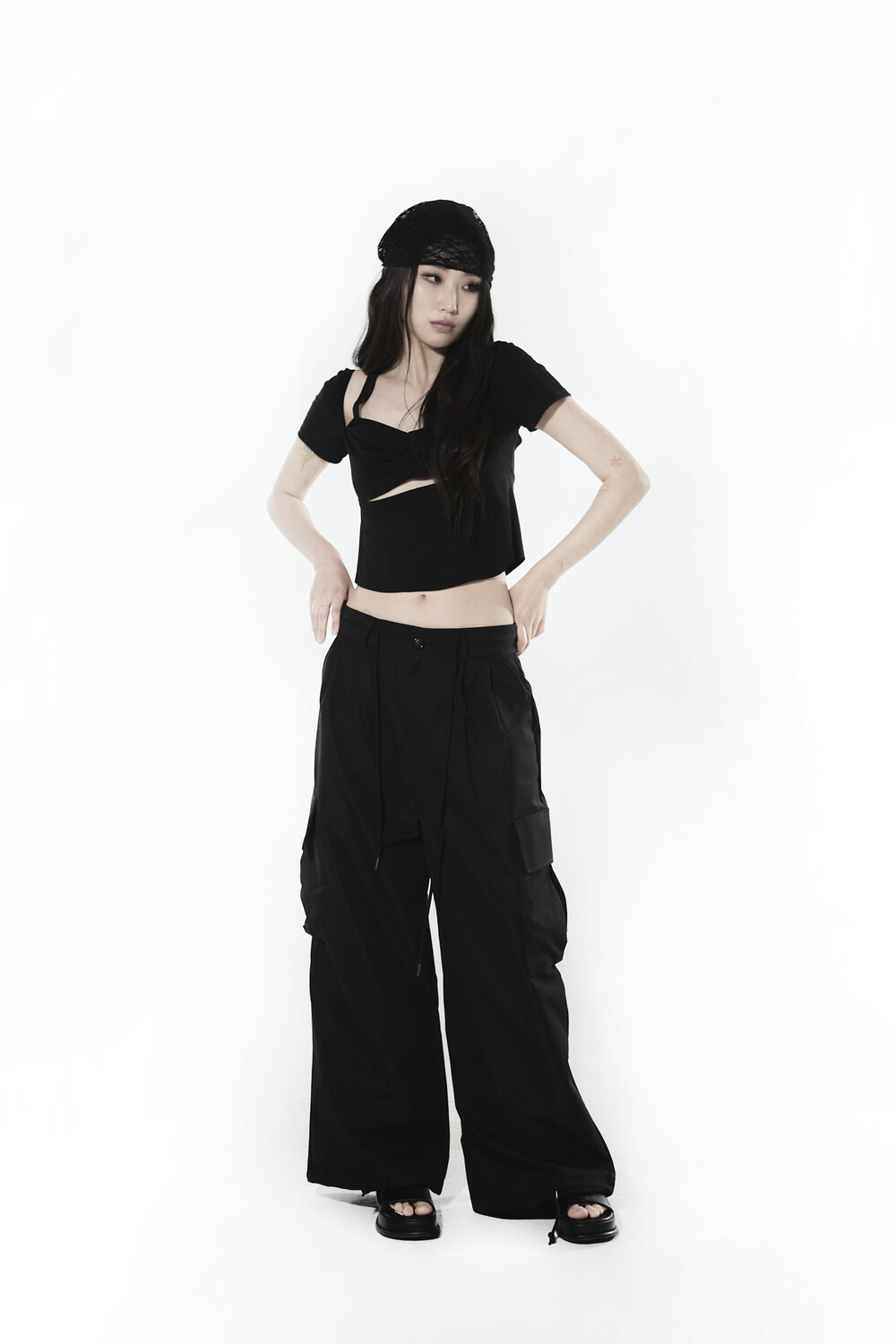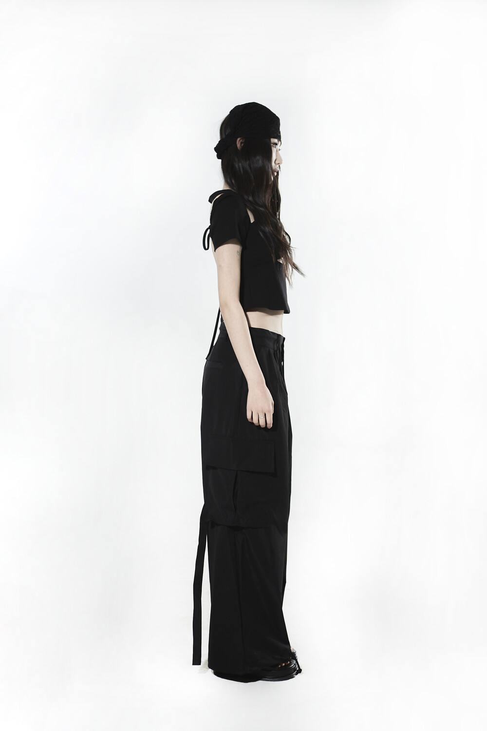 홀터넥, 앞트임의 백리스 디테일이 포인트로, 크롭한 기장의 블라우스 입니다. 캡 추가가 가능하여 속옷 노출 없이 착용하실 수 있습니다.