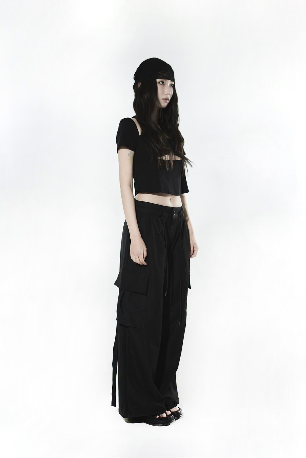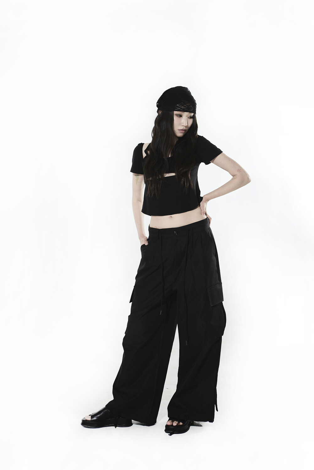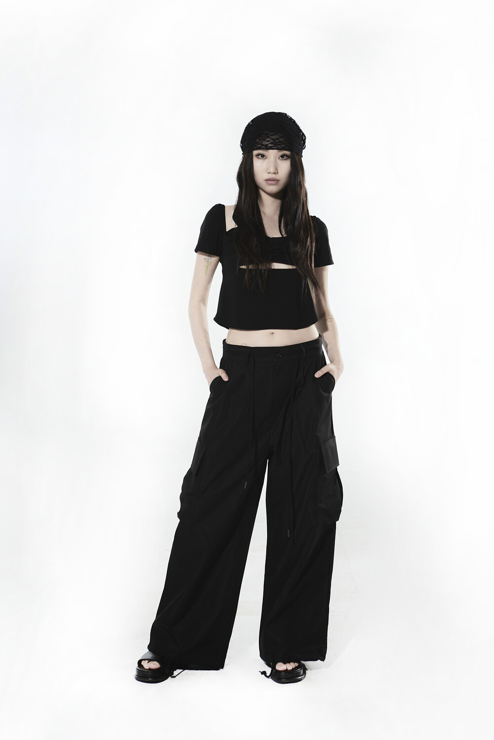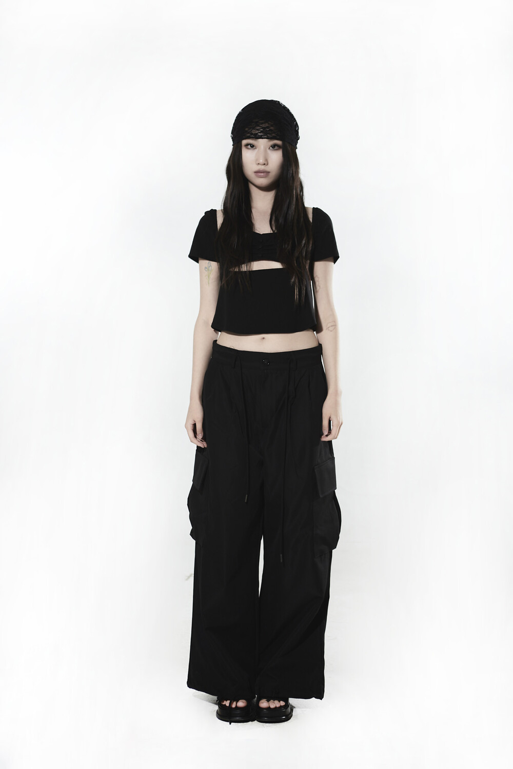 홀터넥, 앞트임의 백리스 디테일이 포인트로, 크롭한 기장의 블라우스 입니다. 캡 추가가 가능하여 속옷 노출 없이 착용하실 수 있습니다.